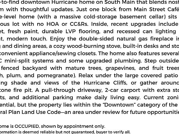 Hard-to-find downtown Hurricane home on South Main that blends nostalgic charm with thoughtful updates. Just one block from Main Street Café, this single-level home (with a massive cold-storage basement cellar) sits on a spacious lot with no HOA or CC&Rs. Inside, recent upgrades include new carpet, fresh paint, durable LVP flooring, and recessed can lighting for a bright, modern touch. Enjoy the double-sided natural gas fireplace in the living and dining areas, a cozy wood-burning stove, built-in desks and storage, and convenient appliance/sewing closets. The home also features several new HVAC mini-split systems and some upgraded plumbing. Step outside to a fully fenced backyard with mature trees, grapevines, and fruit trees (fig, peach, plum, and pomegranate). Relax under the large covered patio with evening shade and views of the Hurricane Cliffs, or gather around the flagstone fire pit. A pull-through driveway, 2-car carport with extra storage closets, and additional parking make daily living easy. Current zoning is residential, but the property lies within the "Downtown" category of the city's General Plan Land Use Codean area under review for future opportunities. The home is OCCUPIED, shown by appointment only. *All information is deemed reliable but not guaranteed, buyer to verify all.