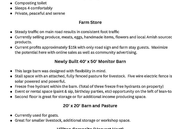 Welcome to your turnkey income-producing farmstead! Enjoy country living while earning from a top-rated luxury tiny home Airbnb, alpaca walks, hilltop campsite, organic gardens & profitable farm store. Features include a new 40'x50' monitor barn, 20x20 barn, 32'x96' high tunnel greenhouse, organic gardens, hayfields, walking trails, babbling stream & u-pick flowers. New detached garage with loft with main house (3 bed, 1 bath). New tiny luxury cottage (sleeps 4) with upgrades galore including jacuzzi deck with separate drive! Opportunity to expand with wedding venue or simple photography site. Also, rental of portion of barn for artist studio potential. Breathtaking views, unmatched serenity & room to grow make this a rare opportunity to live, work, and thrive all in one beautiful place!