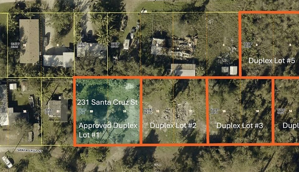 5 duplex building lots (100x100) all in a row plus 1 single family lot (50x100). This package deal comes with approved building and septic plans, $14,000 impact fees paid; making the first lot at 231 Santa Cruz St. shovel ready! The approved building and septic plans are designed to be used on all 5 duplex lots. This deal also includes a single-family lot at the end of the row, 6 total building lot package. City water and electric already installed along the Santa Cruz street.
