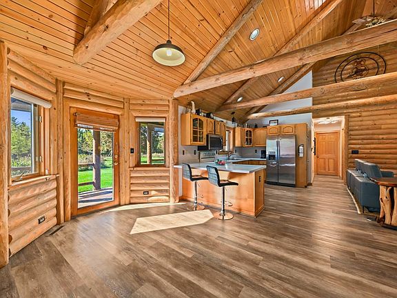 Enter inside this stunning log-sided home, where soaring ceilings and an open-concept design create a warm, welcoming atmosphere. The spacious living room flows effortlessly into the inviting kitchen. Perfect for both everyday living and entertaining guests. With three bedrooms and a thoughtful ranch-style layout, this home offers both coziness and functionality, enhanced by it's beautiful rustic charm. Enjoy peaceful mornings or take in breathtaking sunsets from the large covered back porch or the front deck. Nestled on 4.27 acres, this property perfectly balances natural beauty, privacy, and modern comfort. For hobbyists or those needing extra space, you'll love the 24' x 24' detached two car garage with power, ideal for vehicles, tools, or outdoor toys.