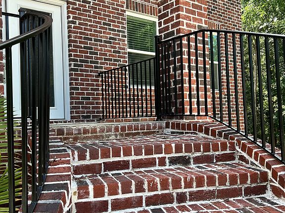 This newly constructed, spacious full-brick house is the largest and most distinctive in the area, featuring 5 bedrooms and 4 bathrooms, including two master suites. All but one bedroom have attached bathrooms. The home boasts stainless steel appliances, granite countertops throughout, hardwood flooring, and marble-tiled bathrooms. A striking brick staircase leads to the main entrance, complemented by a side ramp for easy access. The expansive kitchen includes a large island with a breakfast and bar nook, ideal for large families.