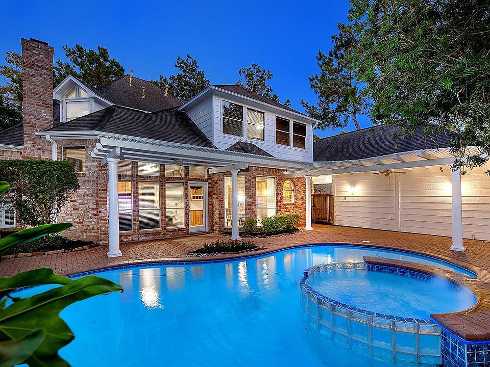 Stunning curb appeal in centrally located Panther Creek! Covered front porch, recent interior and exterior paint, new hardwood floors, 2 gas log fireplaces, granite counters in kitchen and all baths, crown moulding, built-ins and abundant windows allow natural light throughout. Open concept island kitchen with freshly painted cabinets and new backsplash, large pantry, double oven and plenty of cabinet storage overlooks breakfast room with built-in planning desk and den with newly painted built-ins; both formals; wood paneled study with French doors; master retreat down; 3 bedrooms and game room up; large backyard with lanai, sparkling pool with recently replaced equipment and spa surrounded by mature trees.