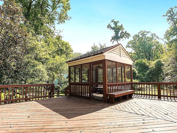Outdoor Space: Expansive yard and deck surrounded by mature trees for privacy and relaxation.