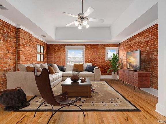 - Description: Brick Wall Accents, High Ceilings, Ceiling Fan, Hardwood Flooring