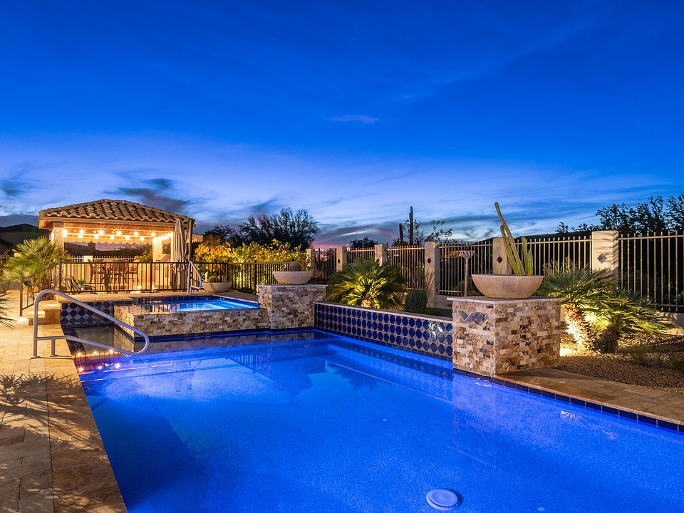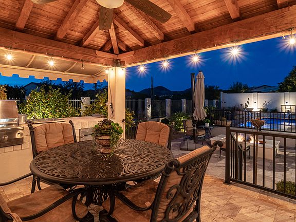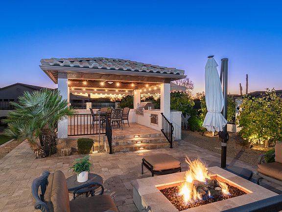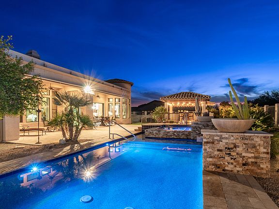Exquisite home nestled in the resort-style gated community of Mountain Bridge on a premium corner lot. No expense spared with every upgrade you can imagine at the time of build and endless custom features and designs throughout after to achieve the perfect balance of style and elegance. 6ft Ext. Length, Climate Controlled, Epoxy 3 car Garage. Gated Courtyard, custom Stained Glass and Iron Front Door, Marble Medallion Insert, Travertine and engineered Wood Flooring, Beamed and Coffered Ceilings, Plantation Shutters and custom Window Treatments plus a 20' Wall of Glass to open and enjoy the spectacular year-round AZ Indoor/Outdoor Living. Private Guest suite with en-suite Bath, Formal Dining, separate Formal Living/Office.Chefs delight Gourmet Kitchen offers CLICK FOR MORE.. Décor 6 Gas Burner Cooktop and Convection Oven and Griddle, Warming Drawer, Subzero Refrigerator/Freezer and built-in Espresso Machine, Butler's Pantry with Subzero Wine Cooler and large Walk-in Pantry. Elegant bay window surrounds the Breakfast Room and opens to the Great Room with Beautiful Limestone Stone Gas Fireplace, Picture-Frame TV, beautifully crafted wall to ceiling Bookcases and Crown Molding. Master Retreat offers Bay Window and Sitting Area, Master en-suite boasts Soaking Tub, Steam/Rain Shower, Dual Vanities and Walk-in Closet. Relax and unwind or entertain family and friends in your own private Backyard Oasis with Breathtaking Sunsets and Mountain Views. Covered Patio that extends the entire back of the home Sparkling heated Pool and Spa with Water Features and beautiful Stone Accents and Planters, Travertine Pavers, Turf and custom-built Gazebo with 42" Viking BBQ, Gas Fireplace. Fruit Trees and a huge Raised Garden for your own home-grown fruit and veg. This is just a sample of what this exceptional home has to offer. Add to this the incredible community of Mountain Bridge and you have Arizona resort style living at its finest. Community amenities include Pool, Tennis, Pickleball, Basketball, Fitness Center, Playground, Clubhouse, Walking and Biking Trails and more. Fantastic location with Great Schools, Restaurants and Shopping, next to Usury Mountain Park, just one mile to the Freeway,15 minutes to Saguaro Lake, 20 Minutes Sky Harbor Airport and Scottsdale.