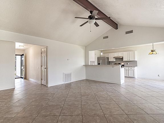 Freshly updated home in Port Neches - Groves ISD! Open-concept den/dining/kitchen. Kitchen with beautiful granite counters and a full stainless appliance package with gas stove, vent fan, dishwasher, and fridge. Inside utility room. Tile floors throughout. Vaulted ceiling in the den. Outdoors offers a private yard and a pergola covered patio.