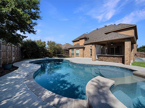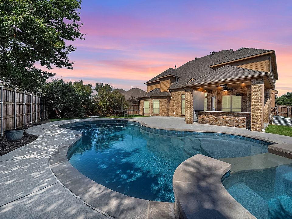 Special financing available with the Seller's preferred lender to include lower than market interest rate! Exquisite North Facing 6 Bedroom Home with Pool in Coveted Lake of La Cima in Prosper ISD! Move-in ready! This light and bright two story home offers an open concept layout with abundant natural light and hand scraped hardwood floors throughout the main living areas. The chef’s kitchen is the heart of the home, featuring ample cabinetry, granite countertops, stainless steel appliances, and a large island that flows seamlessly into the family room. Enjoy vaulted ceilings and a stone fireplace focal point, creating the perfect space for family time or entertaining guests. The private primary suite serves as a relaxing retreat with a spa like bath, including dual vanities, a jetted tub, a glass enclosed shower, and a spacious walk in closet. Upstairs, the game room with wet bar opens to a fully enclosed media room with stadium seating ideal for movie nights and gatherings. Step outside to your own backyard oasis, complete with a sparkling pool and spa, an extended covered patio with outdoor kitchen, and plenty of fenced yard space for kids or pets to play. Additional highlights include six bedrooms, four full baths, a three car garage, and access to community amenities such as two HOA maintained pools and scenic walking trails. Conveniently located near US 380 and Coit Road, with easy access to shopping, dining, and major highways. Discover the perfect blend of luxury, comfort, and location. This one has it all!