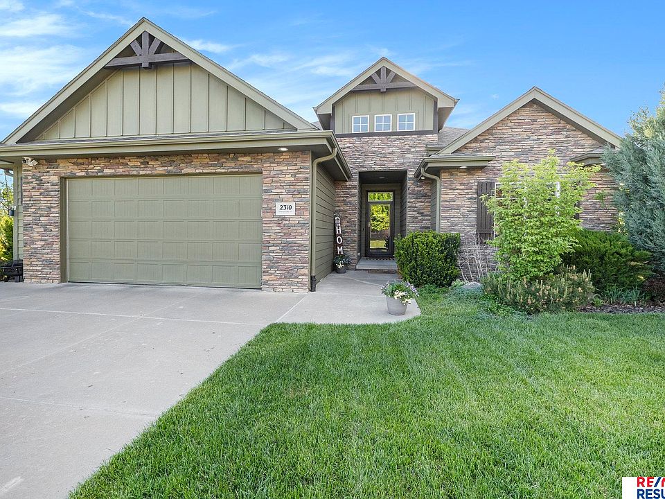 Stunning Custom Ranch in Papillion—Backs to Trees! Step into the wide-open main floor, where soaring ceilings, a stone-wrapped fireplace, and walls of windows fill the space with natural light. Ceramic tile flows throughout the kitchen and living area—perfect for pets and easy maintenance. The kitchen is thoughtfully designed with double ovens, gas range, maple cabinetry, a large prep island, vented hood, walk-in pantry, and a handy pull-out appliance lift. Step outside to a covered deck with pull-down shades and TV hookup, overlooking a beautifully landscaped, low-maintenance backyard with seasonal lake views and ultimate privacy. Downstairs, the walkout lower level is ready for fun—wet bar, space for games, and a cozy office area open to the backyard views. The primary suite offers a true retreat with dual vanities, whirlpool tub, walk-in shower, and spacious closet. A rare blend of comfort, charm, and unbeatable location near Walnut Creek Rec Area—this one is truly special.