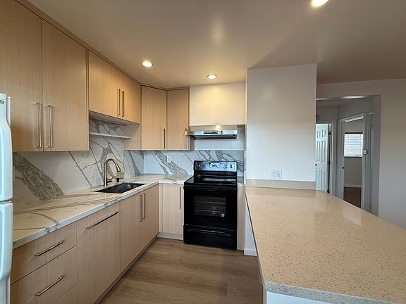 with updated cabinets, appliances, Marble & Quartz counter tops, real hardwood flooring, upgraded bathroom , recessed lighting... Designer colored walls...