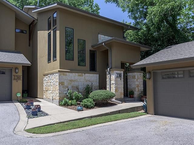 Hill country modern townhouse style, 2 bed, 2.5 baths with flex space. Freshly polished floors throughout the main living areas and a gourmet kitchen, including tons of windows for natural lighting. This unique end-unit features a very shaded deck area that runs the length of the condo, completely private from surrounding neighbors. There is a 2 car garage that is detached from the unit, 2 fireplaces, new paint and carpets. Original owner!