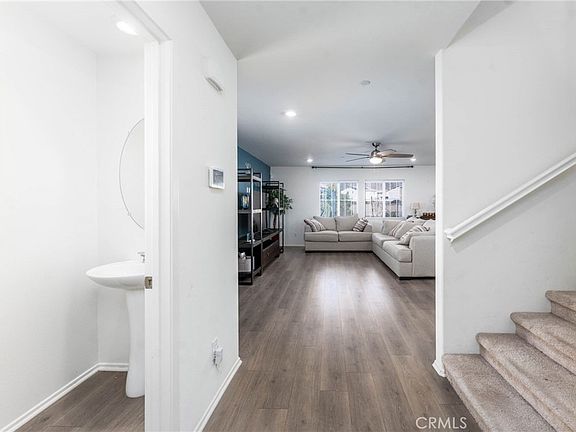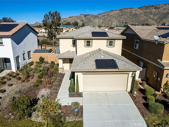 Welcome to Meadow Creek, a prestigious gated community in Moreno Valley. This immaculate two-story smart solar home has plenty of upgrades. Walk into the entrance and see the beautiful luxury vinyl flooring throughout. The family room is open with tons of natural lighting, leading to the gourmet Kitchen. The Kitchen displays upgraded clean white cabinetry and granite countertops, LED recessed lighting, and pantry. Walk up the stairs to the owner’s suite, with a walk-in closet, ensuite bathroom. The other two bedrooms are spacious with walk-in closets and share a hall bathroom. Relax or entertain in the landscaped backyard and take in the views of the mountains. Enjoy privacy with no neighbors behind you. The backyard has custom concrete; artificial turf; and a custom water fountain. Other notable amenities include the attached two-car garage 20 feet deep; paid in full solar panels; whole house fan; tankless water heater; community sparkling Olympic size pool; playground; gym, clubhouse and low HOA. This home is minutes away from Sunnymead Ranch lake, shopping, and freeway access.