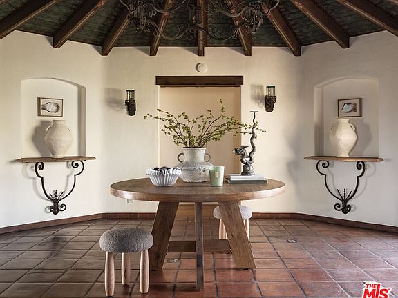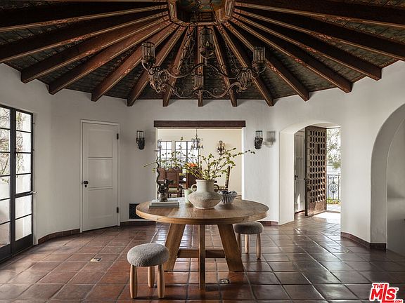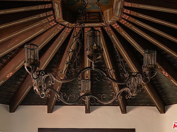 This restored Spanish villa sits on a large promontory offering sweeping views from the city to the ocean. It combines modern amenities with the timeless character of its original period design. A gracious wood beamed rotunda entrance, a soaring vaulted truss ceiling in the living room, large picture windows, French doors with original carved arches, rich wood flooring and Malibu tile accents throughout are just a few of the home's striking design features. The floor plan features a center-island kitchen, wood-paneled office, family/media room, formal living room with a bar and fireplace, formal dining room, and two powder rooms. An interior circular stairwell leads to a spectacular guest suite with a private exterior entrance, an elegant bathroom, and a separate sitting room with a kitchenette. The exquisite grounds include an inner courtyard, multiple patios, an expansive lawn, and a striking swimming pool, all set within a secluded cul-de-sac in The Oaks community.