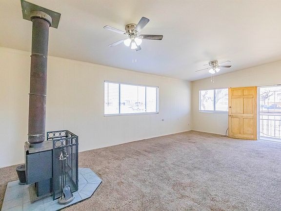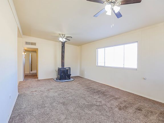 This charming corner-lot home is centrally located and offers 3 bedrooms and 2 fully updated bathrooms. Both bathrooms feature tile flooring and tile surround in the tub/shower. The spacious living room is filled with natural light and enhanced by a cozy wood stove, perfect for added warmth during winter. The semi-open kitchen connects seamlessly to a generously sized dining area, creating a great flow for the busy person. On the opposite side of the kitchen, the utility room includes washer/dryer hookups and an exterior door leading to the side yard, making it a convenient mudroom option. An attached carport provides covered parking and includes a storage room. The property is fully fenced—front, back, and side. Outdoor living is a delight with an expansive covered patio, ideal for relaxation or entertaining. Mature trees, including a pecan tree, can provide ample shade. Recent updates include plumbing renovations in the bathrooms and kitchen, a new water heater, and a fully serviced evaporative cooler with many new parts installed in 2024. Check out the 3D tour and call today to schedule a private showing.