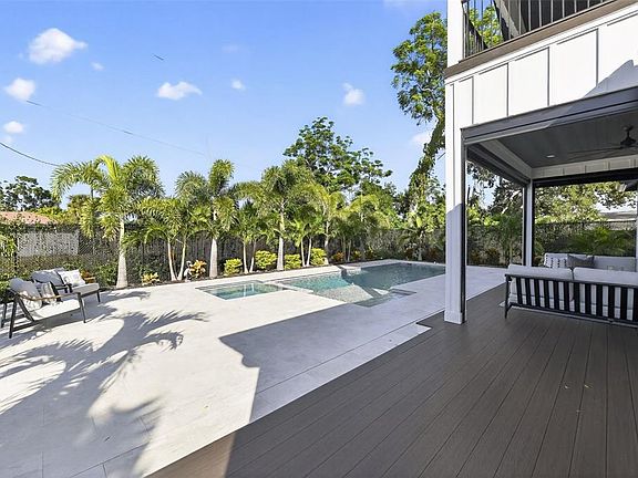 New construction move in ready in desirable Arlington Park area. All the upgrades included built by Clark Horne Construction. Southside School district and minutes from Sarasota Memorial Hospital, downtown Sarasota and Siesta Key Beaches. As you enter the home you will find European oak flooring throughout. The kitchen is a chef's dream with a Wolf 6 burner gas range and Subzero fully integrated refrigerator and freezer columns. The cabinetry is quarter sawn oak with drawers galore, integrated lighting and floor to ceiling solid wood cabinets. Quartz countertops, range hood and oversized island with thick mitered edge create the kitchen dreams are made of. Your butler's pantry completes this space with plenty of room for all of your small appliances and a walk in food pantry connects to the formal dining room. The open concept features a living room right off the kitchen with built in arched shelving and an electric fireplace. A bar area accents the living room with a nugget ice maker and wine refrigerator. The large primary suite is on the first floor with French doors leading to the pool and spa. The primary bathroom features a honed marble wetroom, a double shower, a free standing soaking tub and oak cabinetry. The formal dining room features a spectacular glass and steel partition wall with arched double doors. Wine storage is right across the hall with a glass and steel door to showcase your wine collection. Upstairs you will find a large 18x16 bonus room with a private covered deck along with two large guest rooms. Bedroom two has an ensuite bath with walk-in shower and a walk in closet. Bedroom three has a large closet and a third guest bath. All closets have custom built ins and the garage has 9 feet of built in storage cabinetry. Beautiful LP Smartside siding wraps the home in board and batten accented with wrap around Newtech composite wood decks totaling an additional 1000 square feet of outdoor living space. The pool area is a resort style oasis with a leathered marble pool deck and saltwater pool and spa. An eight foot privacy fence lined with jasmine and tropical landscape complete the backyard and ensures privacy. This home is a true masterpiece, schedule your showing today!
