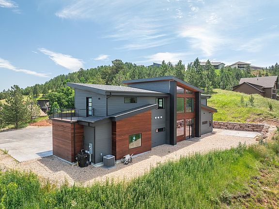 Enjoy views for days at the pinnacle of the prestigious Sandstone Hills subdivision! This architectural masterpiece combines contemporary and minimalist design with the natural beauty of its surroundings, offering unrivaled panoramic views from every angle, making it a perfect retreat for nature lovers. Embrace modern living with a sleek and minimalist aesthetic. The use of Tigerwood, both inside and out, adds warmth and sophistication to the overall design. The interior features four spacious bedrooms designed for comfort and relaxation and three-and-a-half elegantly designed bathrooms with modern fixtures. High-quality, custom-built cabinets provide ample storage and a touch of luxury, while in-floor heating throughout the home ensures a cozy atmosphere even during the colder months. The exterior boasts stamped and stained concrete, offering both durability and a stylish finish. Perfect for those who appreciate modern design and the beauty of nature, this property is a rare gem. Come and see for yourself what makes this modern mountain home truly exceptional! For more information or to book a showing, contact Adam Johnson @ (605) 639-5851 with Pioneer Properties and "Stake Your Claim" today!