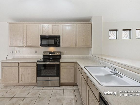 Nestled against Tucson's striking desert landscape, this 3-bedroom, 2-bath home offers a quiet retreat with plenty of modern comfort. The living area welcomes you with tall ceilings and natural light pouring in through sliding glass doors that open to a private patio. Neutral tones and ceiling fans keep the atmosphere cool and airy, making it a relaxing hub for everyday moments and gatherings alike.