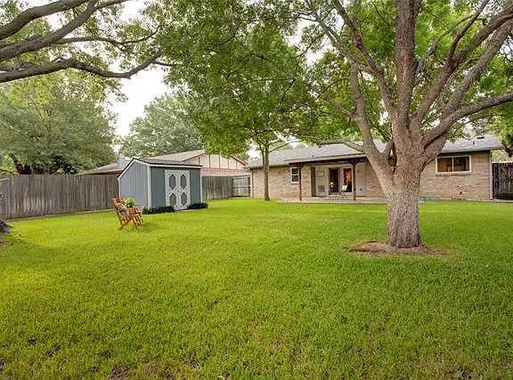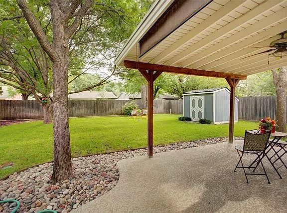 Fabulous backyardLarge covered patioLush green grassPlenty of storageSurrounded by river rock