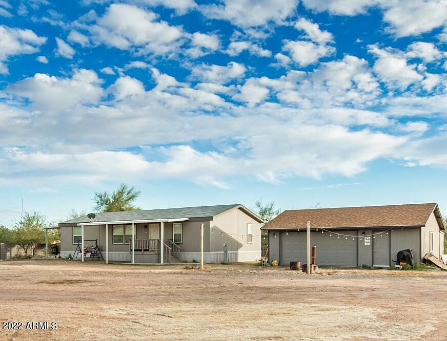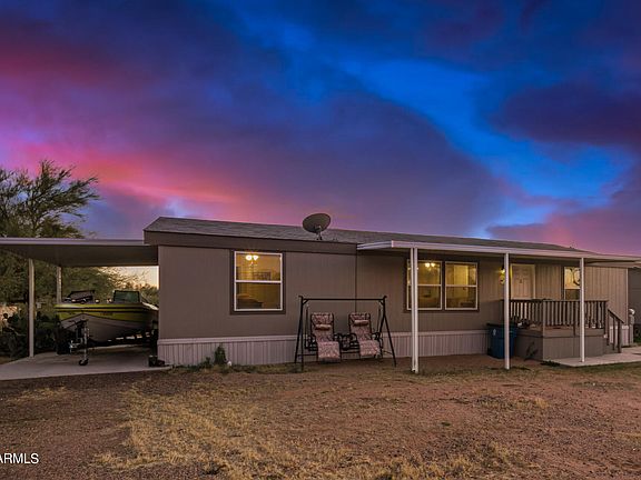 Take a look at this affixed mobile home nestled in over 1 acre of land! This 3 bed, 2 bath property offers a large front yard, carport parking, a detached 2-car garage, & stunning mountain views! Welcome inside to an open floor design with tile & laminate flooring, fresh color palette, vaulted ceilings, updated light fixtures, & bright living room. Immaculate kitchen features upscale SS appliances, plenty of counter space, a walk-in pantry, an island with a 2-tiered breakfast bar, and beautiful wood cabinetry with crown molding. Unwind after a long day in the carpeted main bedroom, providing a pristine full ensuite with built-in cabinets for extra storage. The generously-sized backyard boasts horse facilities and incredible blue-sky views! This home is waiting for you so make it yours now! Please note, green fencing corral panels do not convey with property. All other fixtures to convey.