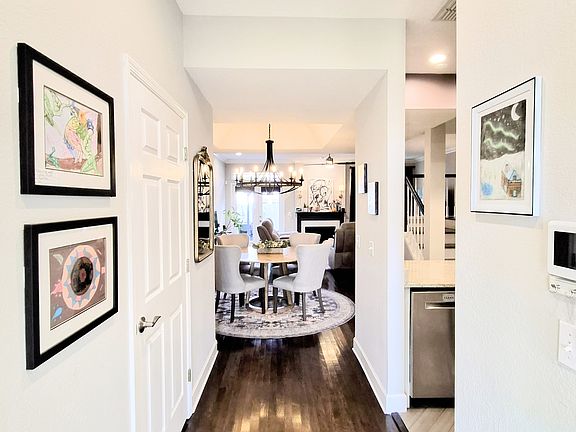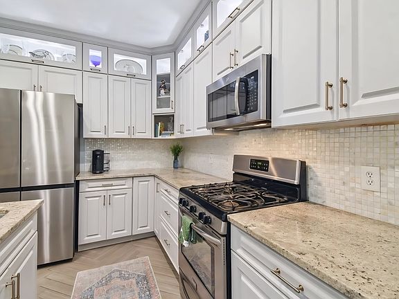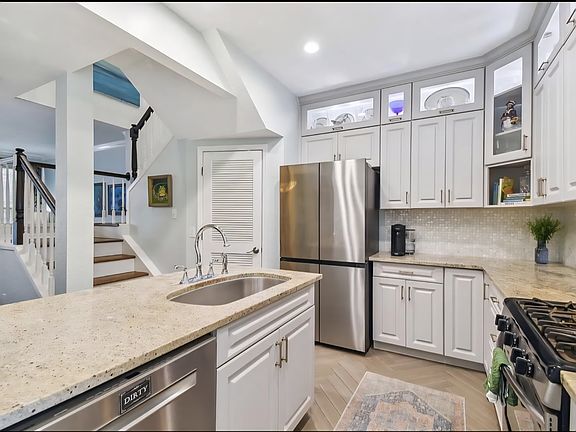 Step inside to an open, light-filled layout with high ceilings, hardwood floors, and designer finishes throughout. The chef's kitchen features quartz countertops, stainless steel appliances, and custom cabinetry ideal for both entertaining and everyday living.