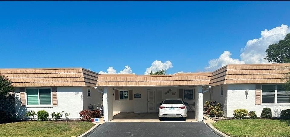 Unusually Available! PRICED TO SELL! MAJOR REDUCTION! No Steps! This is the largest floor plan available from Strathmore! New Roof, Newer HVAC! Lives like a single family home! Absolutely perfect during both storms, no damage or water at all! Back door from lanai has private area for grilling and relaxing! Drive into your covered carport directly into your home, with outdoor sitting area and door to your own laundry room and storage room. Open Floor Plan, granite counter tops, Bosch Dishwasher, huge dining room open to formal living room, spacious family room sliders to enclosed lanai with windows, walk out to private patio for grilling and dining! Primary bedroom with walk in closet, private bath/shower..2nd bedroom/guest sits privately with hall bath. Active over 55 Community with lots of events, large pool overlooking the marina, dock slip is $1384 a year, direct access to intracoastal waterway via one bridge! Minutes to shopping and Siesta Key Beach!