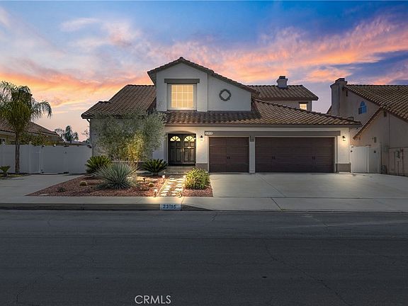 Spacious 5-Bedroom Wildomar Home with Pool, Spa & RV Parking. Welcome to 23115 Twinflower Ave, a beautifully updated 5-bedroom, 3-bathroom home in Wildomar with no HOA and low taxes. This two-story home features a bedroom and full bathroom downstairs, plus a bonus/office room, perfect for multi-generational living or a home office. For cozy winter nights, there is a gas fireplace in the family room and also one in the primary bedroom. The upgraded kitchen boasts granite countertops, a newer "smart", wifi-connected, 5-burner oven/range, stainless steel refrigerator, and a stainless steel microwave (all purchased in 2024). The home has been recently updated with new luxury vinyl plank (LVP) flooring and carpet (2024), a new HVAC system (2023), and a Quiet Cool whole-house fan for energy efficiency. Additional upgrades include a Nest thermostat, tinted windows, ceiling fans throughout, and automatic carriage lights on the garage. The three-car garage comes equipped with programmable garage door openers, a workbench and built-in storage cabinets. For added security, the home includes four exterior cameras and two motion-sensor lights. Step outside to your private backyard oasis, featuring a pool and spa (salt-ready, currently chlorine), both traditional gas heater and solar heating for the pool, and a covered patio—perfect for entertaining. The vinyl fencing, low-maintenance landscaping, and stunning hill views enhance the outdoor space. For those with toys or tools, this property offers RV/boat parking with a 30-amp outlet and included pool and garden sheds. Conveniently located near freeways, shopping, and dining, this home is move-in ready! Don’t miss this incredible opportunity—schedule your showing today!