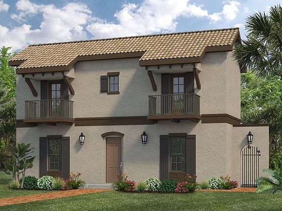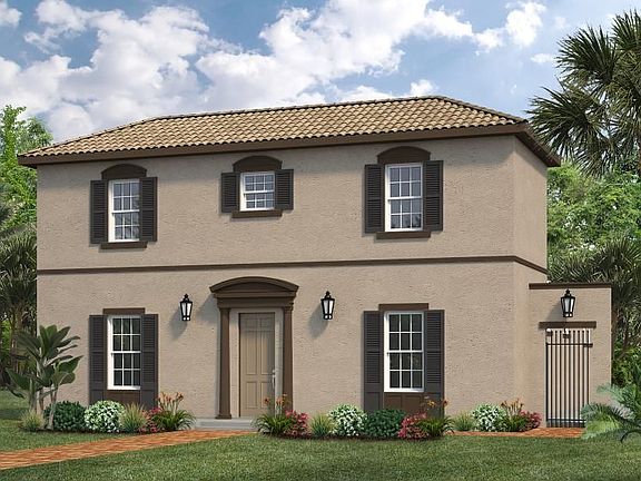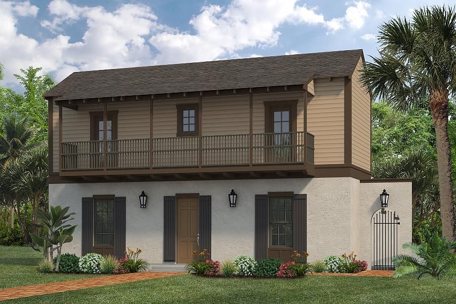 (2,572 sq.. ft.) is a 2-story home with 4 bedrooms, 3 bathrooms, and 2 car garage. Features include a private courtyard with covered veranda and first-floor master suite. Golf cart garage and studio options available. (Studio opt. adds an additional 505 sq.ft.).
