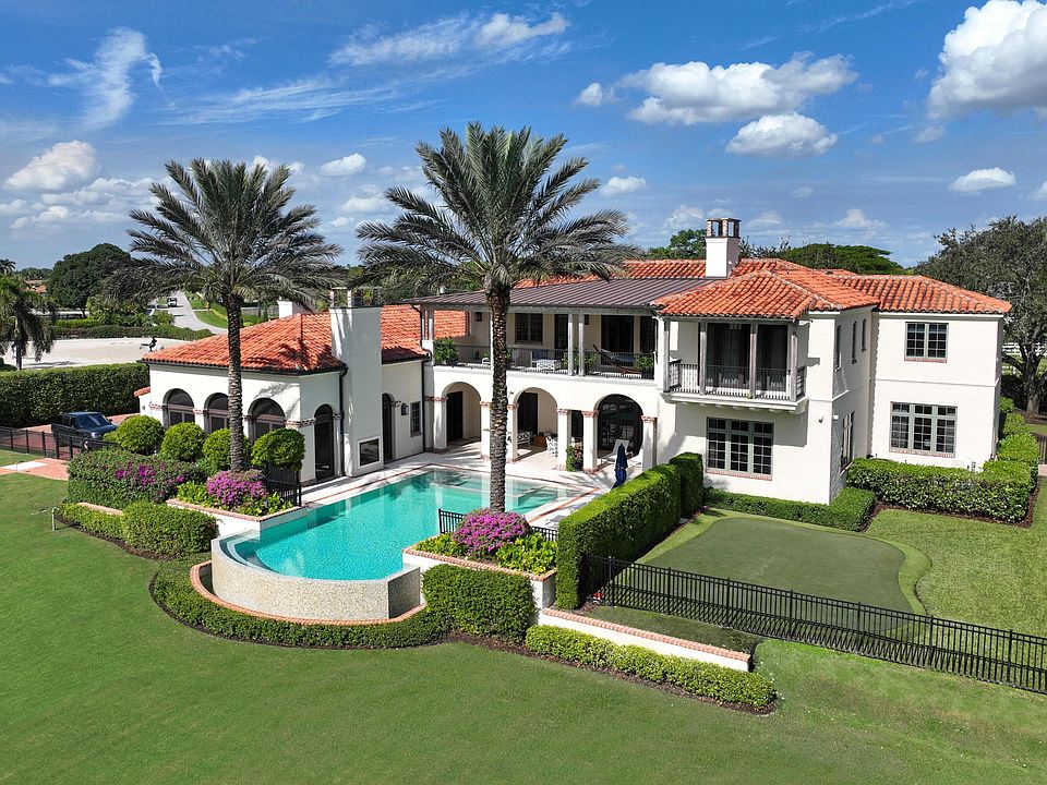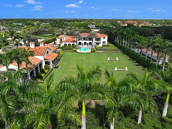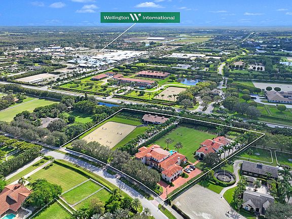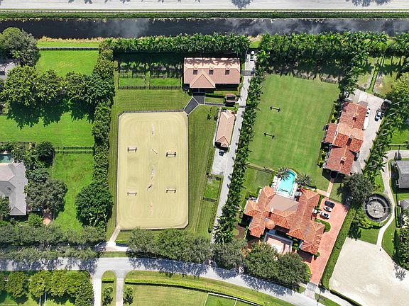 An exceptional Wellington Equestrian Estate just four properties from PBIEC, offering an unmatched location mere minutes walking to the show rings. This Palm Beach-style compound spans over 4 acres across two lots and includes an exquisite 5-bedroom plus office main residence with a guest apartment, two 8-stall barns, a 3-bedroom staff apartment, an oversized new riding arena, Grand Prix Field and 7 paddocks. A rare opportunity to own a top-tier equestrian estate steps from the horse show. Designed by architect Roger Janssen, the main home features elegant living and dining spaces, a billiards room, office, screened porch, butler's kitchen and well-appointed kitchen and family areas. Upstairs hosts the primary suite and three additional bedrooms. Premium finishes include cypress ceilings, custom cabinetry, hardwood flooring, a full-house generator, Infinity pool overlooking the field and much more.