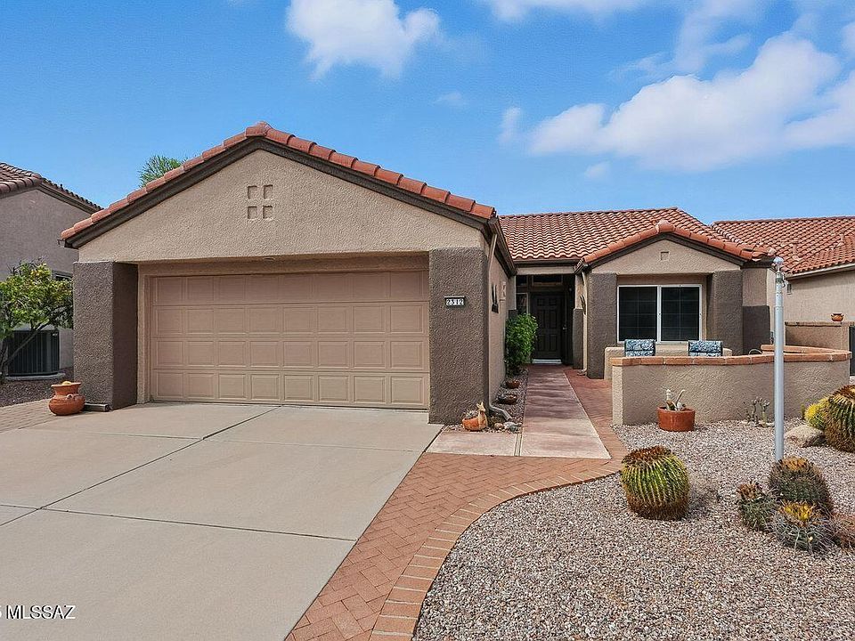 A sweet home w/beautiful upgrades including an expanded kitchen & built in desk area w/gorgeous granite countertops. Newer appliances, extra storage & a dining area w/a mountain view. Primary bath w/upgraded sink & shower/no tub. Rolling shutters at the back of the house help you stay cool. The backyard w/its low care landscaping, enlarged brick patio & extended Ramada is a relaxing place to enjoy your Catalina Mountain views!You will enjoy sitting in the front courtyard watching the sunrise or the moonrise & the mountains turning pink in the evening as they often do. Well maintained: Exterior freshly painted in July 2025. water heater 2025, roof 2019 HVAC system 2019Inside laundry w/newer washer & dryer included. A lovely place to have & enjoy as your own! Active adult community.