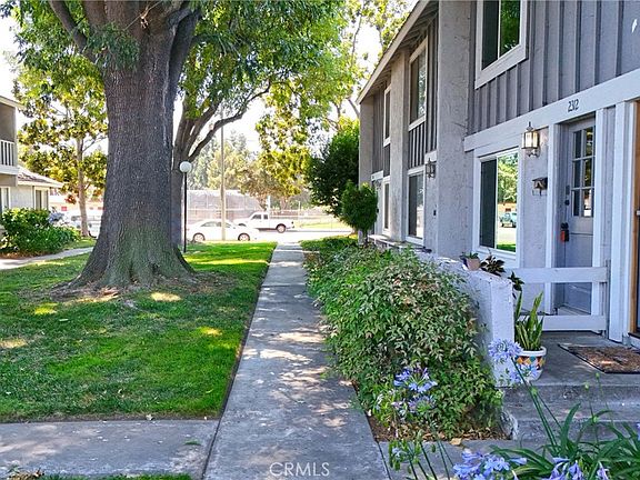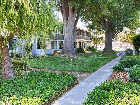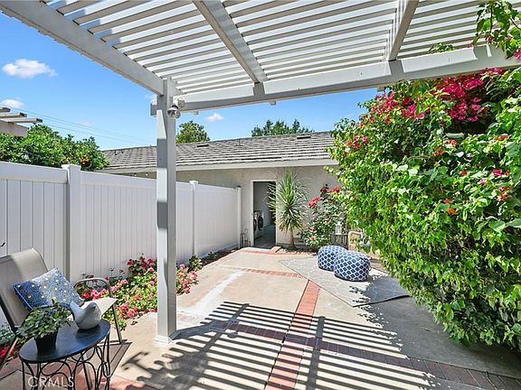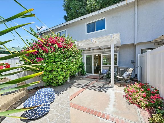The functional kitchen is well-equipped for all your culinary needs. A ceiling fan keeps you cool while cooking, and a garden window adds a touch of charm. A convenient slider door opens onto the private courtyard, perfect for indoor-outdoor entertaining. For added convenience, there is a downstairs powder room. The stylish stairway leading to the bedrooms features luxury vinyl plank flooring for a modern touch. Retreat to your private haven in the spacious primary bedroom. Mirrored wardrobe closet doors maximize space, while a pocket door leading to the en-suite bathroom with a newly remodeled shower ensures privacy. The second bedroom offers versatility – use it as a guest room, home office, or hobby space. Built-in bookshelves provide ample storage, and mirrored wardrobe closet doors create a sense of spaciousness. Unwind and relax in your own private courtyard oasis. Lush greenery, including beautiful roses and bougainvillea, creates a tranquil atmosphere. Enjoy outdoor dining under the shade of the vinyl patio cover, and unwind with friends and family while surrounded by the beauty of nature. Vinyl fencing ensures privacy and a low-maintenance exterior. This move-in-ready home boasts newer plumbing and a newer heating and air conditioning system for optimal comfort. Enjoy fresh paint throughout the interior, creating a bright and inviting ambiance. The spacious two-car garage offers ample storage space for your vehicles and belongings. Laundry hookups are conveniently located inside, and vinyl plank flooring ensures easy cleaning. Built-in cabinetry provides additional storage solutions. Enjoy the benefits of a lower hoa which covers exterior maintenance and a swimming pool. This charming Palm Gardens home offers the perfect blend of comfort, convenience, and a low-maintenance lifestyle. Don't miss your opportunity to call this your own.