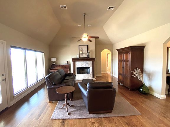 What a jewel of a home! Enjoy this energy efficient Clark Edward's build (top quality finishes). 4 bedrooms, 2 baths, 3 car attached garage, covered patio, sprinkler system on private water well, wood privacy fence, water softener, brand new a/c condenser, & above ground shelter. Corner lot on cul-de-sac in the highly desired Skyview Estates Neighborhood. Gorgeous kitchen with a pantry, butcher block island, stainless steel appliances, gas stove, granite and hardwood oak floors throughout! Snuggle around the fireplace. There's built in corner storage in dining room and bench off laundry room. Master suite has travertine ceramic tile flooring & shower, separate master tub, with double sinks and trey ceilings.