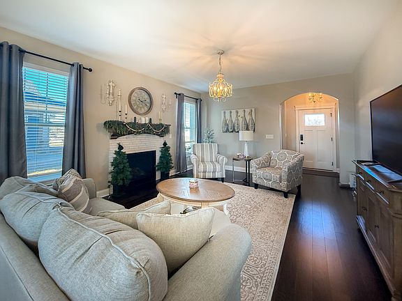 Experience the perfect blend of refined elegance and modern design in this stunning 3-bedroom, 3.5-bathroom home with a 3-car garage. As you enter the front door the of the foyer, you'll be greeted by a beautifully arched opening which leads into the spacious living room featuring a gas fireplace surrounded by tile and a custom mantle, complemented by hardwood floors, 9-foot ceilings, and stylish upgraded light fixtures. The dining room is open to the living room and kitchen with georgeous chandellier and sliding glass doors that open to a private, fenced backyard with a covered patio, built-in firepit and water feature. The kitchen is a chef's dream with a tile backsplash, granite countertops, 42-inch dovetail cabinetry with soft-close drawers, crown molding, floating shelves, a farmhouse sink, and stainless steel appliances. A mudroom with cubbies and a built-in desk leads to a large walk-in pantry w/ with plenty of shelving. Stylish 1/2 bath is also conveniently located on the main floor. Up the stairs a bright inviting hallway with decorative wrought iron railing along the staircase and designer light fixture, you'll find two spacious bedrooms, a full bathroom, and a convenient laundry room. The master bedroom also located on the 2nd floor boasting vaulted ceilings, a private en-suite bath with double sinks, a granite countertop, a soaking tub, and a tiled shower with separate walk-in closet. The basement includes a full bathroom and additional space with egress access. Custom Blinds stay with house. Furnace 3 yrs old, A/C 2024. New park just a block away.