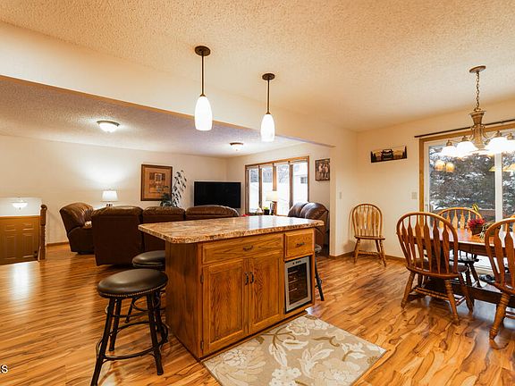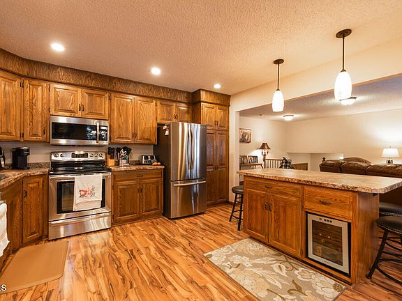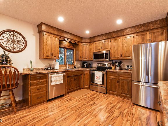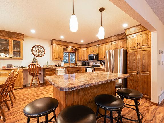 The upper level includes an oversized living room, kitchen, and dining room. You are sure to appreciate the open concept. The kitchen was remodeled 12 years ago to create a spacious entertaining area. Kitchen features newer stainless-steel appliances, a large island with a wine fridge, newer flooring, plenty of cabinets and countertops throughout. Also on this level are 2 oversized bedrooms and an updated bathroom with a beautiful custom tile shower and dual sinks. The walk-out basement includes: a large family with a beautiful, white-washed brick gas fireplace, updated bathroom and 2 large bedrooms. There is new carpet throughout. Off the main floor entrance leads to a ½ bathroom/laundry room. The 2-stall garage has an epoxy floor. There is also a 20x18' shed (360 sq ft) has concrete floor and propane heat. This is a great space for hobbies and offers additional storage. There is a hot tub hookup off the deck. Backyard is private with mature trees and is fully fenced. There is also a nice garden area. The sprinklers were updated by Brendel's Sprinklers. This home sits on .4 acres, providing you plenty of room for an additional garage (up to 1,200 sq ft per City approval), pool, etc. Other updates include: Anderson windows, newer paint, new water heater (4-5 years), newer toilets (3 years old), new roof/gutters (2023), washing machine (2025). This home is conveniently located close to schools, parks, and more! Call today to schedule a private showing.