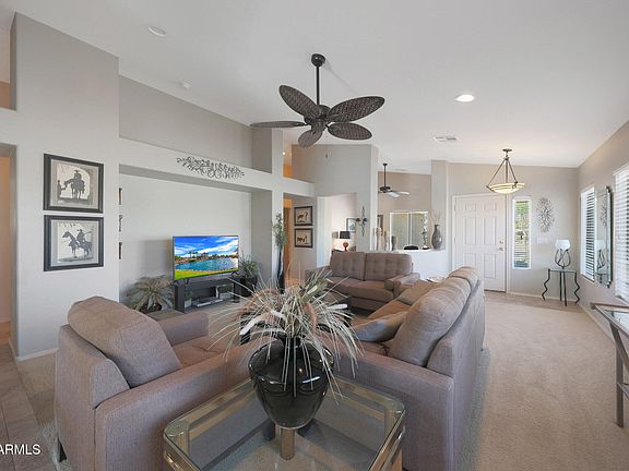 Relax and enjoy life in this impeccably maintained two bed, two bath home with a versatile office/sitting room that adds flexible living space. Vaulted ceilings and an inviting open floor plan make entertaining easy, while the bright open kitchen overlooks the beautifully landscaped backyard. Enjoy a shaded covered patio—perfect for morning coffee or evening gatherings—as quail and bunnies visit. The ideal north-south lot and 2-car garage enhance comfort and convenience. Located in Sundance Active Adult Village: enjoy tennis and pickleball, pools and spa, fitness center, billiards, card rooms, library, ballroom, nearby golf (non-HOA), and stunning mountain views.