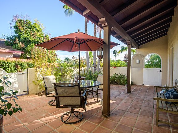 Experience the timeless allure of this Upper East Spanish Classic! Crafted in 1929 for the distinguished Bergen Family, this enchanting property exudes the enduring charm of old Santa Barbara. As you step inside, your eyes are drawn upwards to the grandeur of 14-foot wood beam ceilings that crown the majestic living room, a space filled with character and grace. French doors and picture windows invite the outdoors in, and a gas fireplace adds warmth to the ambiance. The living room and adjacent dining room flow to the tiled front patio, where a soothing fountain adds a touch of tranquility. The chef's kitchen is a true gem, boasting PJ Milligan pine cabinets and an abundance of counter space. Savor your morning coffee or tea in the cozy breakfast nook - a delightful touch to your daily routine. Venturing upstairs, the primary bedroom bathes in natural light, offering clear mountain views and a captivating vista of the lush pool area. Fine details grace every corner, from high ceilings to exquisite original hardwood floors, recessed lighting, and Juliette balconies. It is a space where elegance and comfort coalesce. Outdoors, the expansive backyard resembles a private park, complete with a spacious patio, inviting pool, soothing jacuzzi and serene koi pond. Entertaining friends and family has never been easier with this magnificent backdrop. The elongated herringbone brick paver driveway accommodates several vehicles, and the detached two-car garage features a convenient storage room. The large lot, outdoor patios, and well-manicured perimeter foliage ensure a sense of seclusion and privacy. Located in proximity to downtown shopping, a vibrant restaurant scene, parks, and schools, this home offers the quintessential Santa Barbara lifestyle. If you're seeking the perfect blend of indoor-outdoor living and the iconic red tile charm of the Upper East, your search ends here. Prepare to be enchanted and fall in love with this extraordinary lifestyle. Schedule a showing and seize the opportunity to make it your own today!