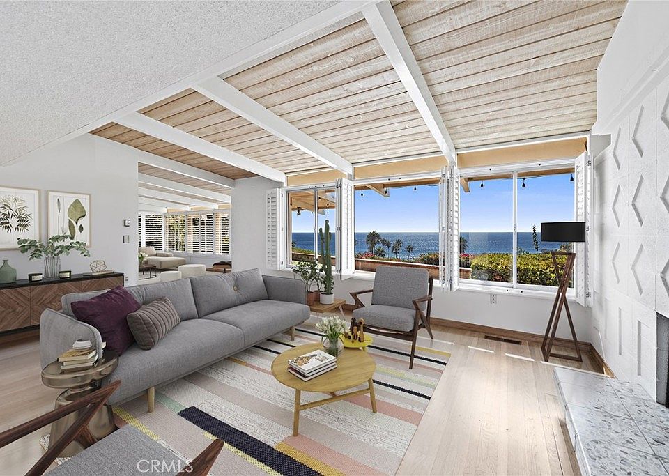This is a rare opportunity to own a bluff front home in San Clemente’s fabulous Riviera District. This well-preserved 1961 Mid-Century Modern home offers sublime ocean, whitewater, beach, Seal Rock, and Catalina Island views that are among the finest in southern Orange County. Additionally, this is a unique opportunity as this location within Riviera offers a wide range of development opportunities. The list of benefits that accompany ownership of this home is extensive, from a large corner lot spanning about 13,200 square feet and a sunny backyard patio with unobstructed ocean views, to a bright open-flow floorplan of approximately 2,100 square feet. A circular driveway and a large, private entrance courtyard make it easy to entertain both large and small groups of friends. A tropical garden enriches the courtyard, and period-perfect breezeblock epitomizes the home’s MCM roots. 1960's cachet continues throughout the interior, where metal screens, original hardwood flooring, floor-to-ceiling windows and beamed ceilings are proudly displayed. Framing phenomenal ocean views, the great room features a classic fireplace, a built-in China cabinet adorns the dining room, and the white-on-white kitchen boasts an island, a Thermador double oven, and a breakfast nook with custom stained-glass window. Three bedrooms and two baths include a primary suite with mirrored wardrobe doors, the interior laundry room features a sink, and extensive closet storage is available throughout the home, complete with lighting and built-ins. Baths reveal original soft-pink or blue sinks and tubs, and the two-car garage exhibits original Mid-Century Modern doors. The Riviera District is the crown jewel of Southwest San Clemente and offers great beach access, surf, and access to the San Clemente Beach Trail. San Clemente’s pier is a short distance up the shore, and schools, restaurants, parks and golf courses are close by.