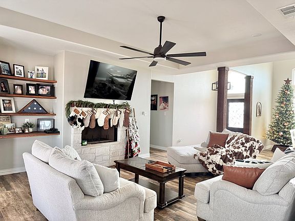 Stunning Custom home built in 2024 on 10.94 acres!! High ceilings throughout with breakfast area and formal dining area with beautiful stained wood columns. Living room has a wood burning fireplace with wood shelves that can be removed for a Christmas tree. This house has plenty of natural light. Great size bedrooms and bathrooms that have big walk in showers. Recently installed pipe fencing on the property and roping arena, and a fenced area for animals. Don't miss out on this house!!