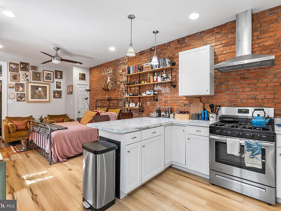 The important details: Laundry, private entrance, dishwasher, big kitchen, private patio, heat included, exposed brick and bedroom that fits a queen-sized bed. Bring your own A/C window units this unit does not have central air. Designed with an industrial feel of exposed brick and high ceilings with warm and homey touches of wide plank floors, recessed lighting and classic radiator heat (included in rent). Spacious cook's kitchen with brand new stainless steel Frigidaire appliances and breakfast counter for 3 stools. Private 150 sq. ft. back patio. No bedroom closet but space for you to add a wardrobe. Tenant pays only electric and internet/cable. Great Fishtown location: steps from Meetinghouse Pub and a short walk to Riverwards Produce, Loco Pez, Circles and Squares Pizzeria, and Philadelphia Brewing Co. Just 15 minutes to Berks Station on the Market-Frankford El. One cat may be considered with refundable pet deposit. To apply: $50 credit/background check, proof of income, landlord reference, and valid ID.