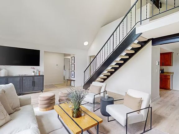 Spacious loftBright open-concept floor planLake accessVaulted ceilingsTall evergreensPrivate hot tub