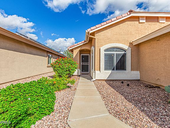 Become the proud owner of this delightful 3-bedroom home on a coveted golf course lot! You're greeted by a 2-car garage and a charming desert landscape for excellent curb appeal. Discover a welcoming living room with vaulted ceilings, plantation shutters, and durable tile flooring for easy maintenance. The eat-in kitchen comes with granite counters, wood cabinets with crown moulding, stainless steel appliances, a walk-in pantry, and a center island for extra prep space. The bright primary bedroom features an ensuite with double sinks and a walk-in closet for an organized wardrobe. Imagine enchanting evenings in the lovely backyard, boasting a covered patio, stylish pavers, and serene views of the white tank mountains & Hole # 4 in Sundance Golf Club. Don't miss out on this incredible gem!