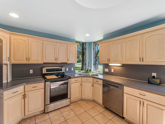 This custom walk-out rambler offers an open-concept design with three bedrooms and numerous upgrades, including Andersen Low-E windows. Set on a ¾-acre lot that backs to 10 acres of wooded city-owned land, the home combines privacy with beautiful natural views. The kitchen features newer stainless steel appliances—range, refrigerator, and dishwasher—solid oak paneled cabinets, and a floating island. A striking 12' x 8' window in the living room overlooks the backyard and woods, complemented by a moveable free-standing electric fireplace. The main-level owner's suite includes a Jacuzzi tub, walk-in shower, and a spacious walk-in closet with built-in shelving. Additional highlights include a four-zone hot water heating system, central air conditioning, and a newer water heater. The attached heated garage measures 22' x 24', comes with an opener and MyQ smartphone hub, and includes a 220-volt outlet and a hose faucet for added convenience. A GAF roof, installed in 2018 by a licensed contractor, completes this well-maintained home.