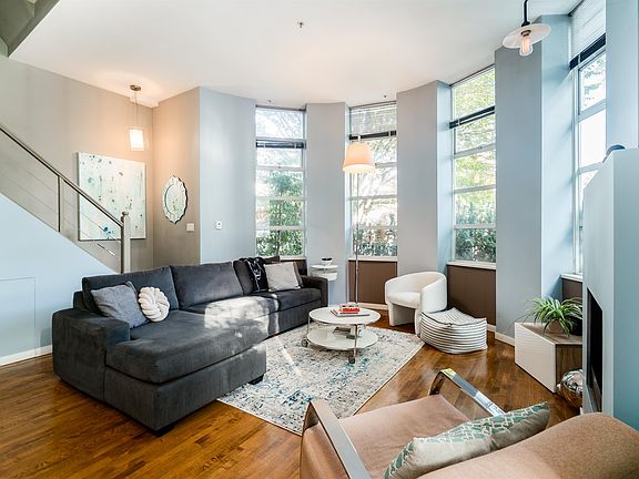 Come see this absolute gem! Rarely available turret-style townhome with your own private entrance at The Omega! Situated in the heart of popular Fairview, this bright, northeast corner residence features soaring 11' ceilings, dramatic floor-to-ceiling windows+ a super spacious open-plan design. The main level includes a curved living room wall, gas fireplace, open kitchen with stainless steel appliances, separate dining area, powder room for guests+ mudroom/pantry. Upstairs offers a king-sized primary with deep closet+ ensuite, a generous second bedroom+ a 3-piece bath with walk-in shower. Amazing, community-focused, friendly neighbourhood+ just steps to Whole Foods, the Seawall, Granville Island, transit+ a quick zip by train to YVR.