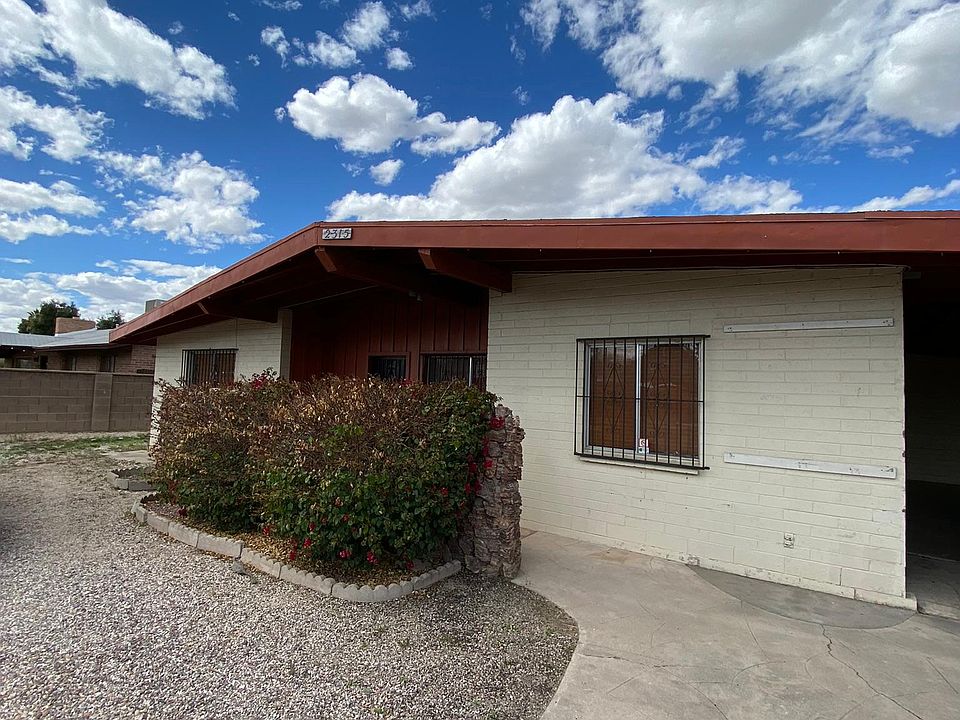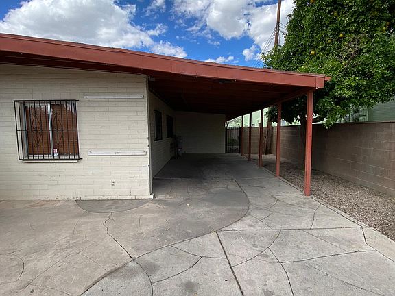 This uniquely designed 4 bedroom, 2.5 bath home features a large dining and living room with fireplace and a den. Rooms are open and spacious with ceiling fans throughout. The generous sized kitchen contains all appliances except microwave as well as a washer and dryer. Feel safe and secure with rod iron and security doors. Huge back yard with covered awnings and separate side yard. Two car garage as well as a covered car port in front.