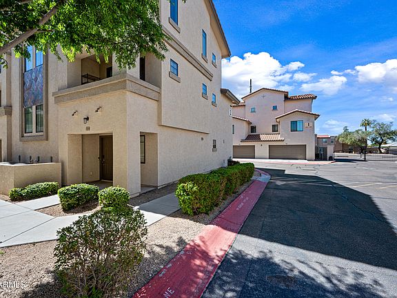 Just minutes from the hiking trails at Papago Park this contemporary three-bedroom townhome welcomes you with fresh interior paint and a stylish staircase leading to an open living and dining area. The updated kitchen shines with modern cabinet hardware, stainless steel appliances, a smart refrigerator, and granite countertops with a breakfast bar. Each floor features a bedroom and full bathroom, offering privacy and flexibility. Upstairs, the spacious primary suite features a walk-in closet, an ensuite bath with a separate tub and shower, and a flex space perfect for an office, reading nook, or gym. Modern light fixtures enhance the home, and the garage includes an electric car charger. The Residences at Oak Condominiums offer a community pool and spa.
