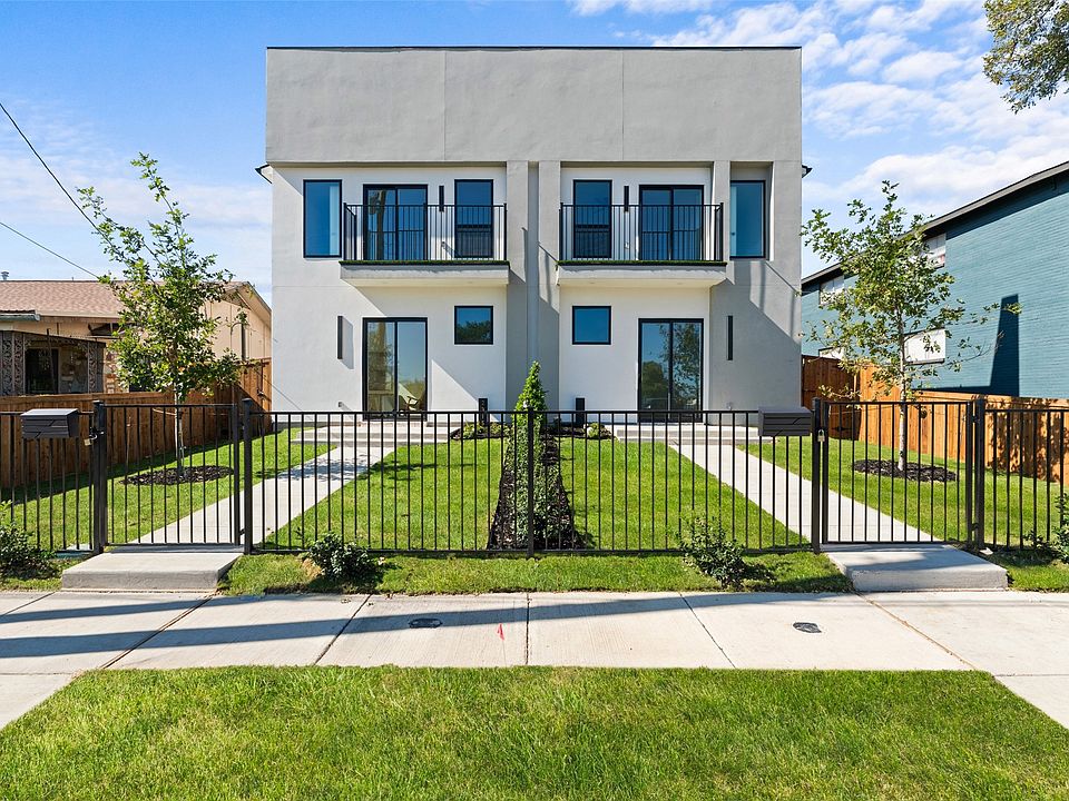 A&B Custom Homes has done it again! Modern luxury meets prime location in this brand-new half duplex, offering a rare combination of design, comfort, and convenience. Featuring three spacious bedrooms, each with its own full bathroom, and a first-floor primary suite, this home is designed for both functionality and style. Step inside to soaring 19-foot ceilings in the living room, creating an airy, open-concept space centered around a sleek electric fireplace and an abundance of windows that allows the natural light to flood all the spaces. The home showcases white oak hardwood floors throughout the living areas and bedrooms, complemented by custom white oak cabinetry in the kitchen and baths. Quartz countertops, a gas range, and a tankless water heater bring elevated performance and energy efficiency, while foam insulation and a front and back sprinkler system add everyday ease and comfort. Perfectly positioned across the street from a brand-new Target and a soon-to-open Halperin park above I-35, this property puts you at the center of growth and excitement. Plus, you’re just minutes from downtown Dallas, making it ideal for anyone who wants modern design paired with an unbeatable location. Sleek architecture, quality materials, and proximity to the city’s newest amenities — this home truly has it all.