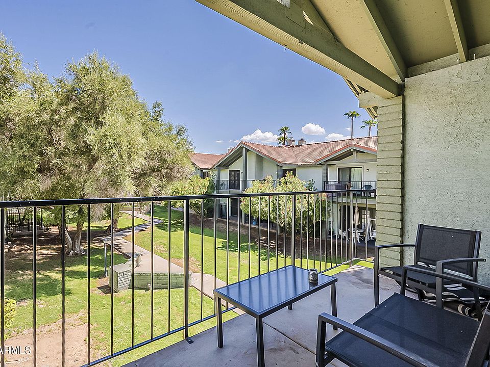 Step into this stunningly refreshed 2-bedroom, 2.5-bath end-unit townhome nestled in a peaceful North Phoenix enclave. Bursting with style and modern charm, this move-in ready gem features fresh interior paint, rich luxury vinyl plank flooring, sleek quartz countertops, and beautifully upgraded tile showers. The kitchen boasts matching newer stainless appliances, creating a seamless and sophisticated look. Enjoy the comfort of two spacious en-suite bedrooms, each with private balconies perfect for coffee or evening relaxation. A convenient half bath along with a private patio downstairs, adds to the home's functionality and appeal. Additional perks include 2 covered parking spaces, access to a sparkling pool and HOA includes trash/ water/ sewer/ pest!