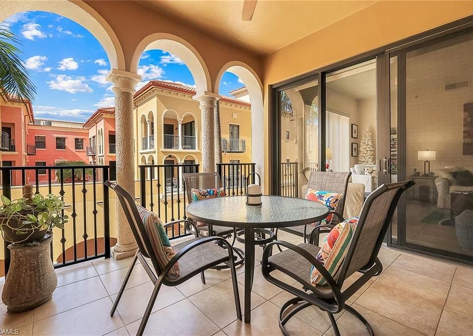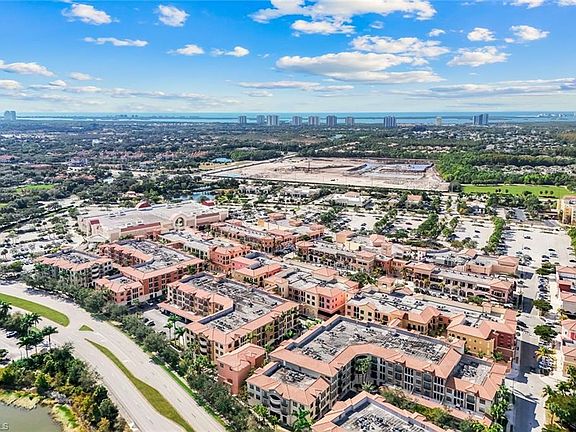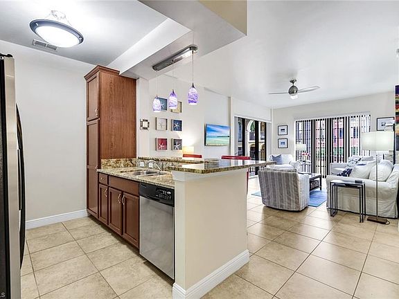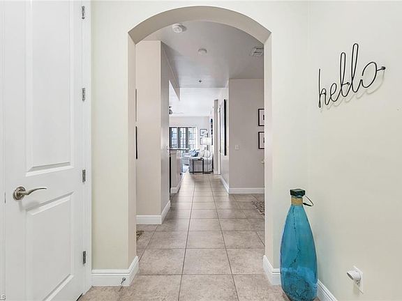 Fabulous - Beautifully maintained 2-Bedroom, 2-Bath residence featuring an open dining room or flexible den space. Enjoy tile flooring in all main living areas, warm wood floors in the bedrooms, and a granite kitchen with raised wood cabinets, stainless-steel appliances, and fun updated light fixtures throughout. This home offers a spacious lanai with beautiful sunset exposure overlooking a charming terrace framed by palm trees—perfect for relaxing or entertaining. The light and bright interior provides an easy canvas to personalize, enhanced by modern ceiling fans and stylish finishes. The primary suite includes a custom-organized master closet and a beautifully appointed bathroom featuring a soaking tub, separate walk-in shower, dual sinks, and a wonderfully spacious, luxurious feel. The guest bedroom is on the opposite side of the condo offering it's own privacy and bathroom with granite counters, linen space and quality finishes. Additional conveniences include a private in-unit washer and dryer, a utility room, and a storage space located just outside the unit. There is a closet as soon as you enter the condo for additional storage, 2019 Trane air conditioner with U/V light filter and A/C Maxtech system with digital thermostat, Whirlpool appliances and more. Owner has taken beautiful care of the condo and it shows. Residents enjoy secured building entry, under-building parking (1 assigned space # 22) , beautiful common areas, a well-equipped fitness area, and a resort-style pool—ideal for hosting family and friends. HOA fees include high-speed internet, premium cable, water, sewer, and trash, creating an effortless, lock-and-leave lifestyle. Located in the heart of the desirable Uptown Coconut Point lifestyle, you are walkable to over 150 shops and restaurants at Coconut Point Mall and just minutes to Hertz Arena, RSW International Airport, and I-75. Natural light fills every room, making this property the perfect combination of comfort, convenience, and vibrant living.
