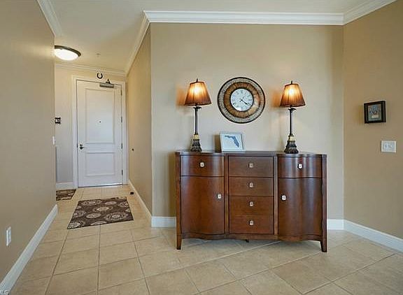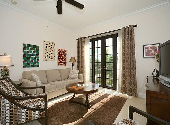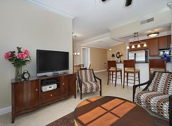 Rarely available top floor end unit with 3 full bedrooms and 2 full baths, freshly painted and includes 2 assigned parking spaces, #57 and #58, secured and gated underneath the building. All living areas are tiled and also include crown molding. This layout is very open and offers sunny Southern exposure. Enjoy this sunny corner top floor unit. Quality construction throughout, with impact-resistant doors and windows, solid core interior doors, 10 foot ceilings, quartz counter tops and stainless steel kitchen appliances. This residence is immaculate, was never rented out and never had any pets. This building has a desirable location within The Residences and is adjacent to the large, heated resort-style pool & spa, fully-equipped fitness center & outdoor gas BBQ grille. Walk to 20+ restaurants and cafes as well as 100+ shops and 16-screen movie theatre. It is a short drive to RSW International Airport, Germain Arena, Miromar Outlet Mall, Gulf Coast Town Center and Florida Gulf Coast University, as well as to our sugar white sand beaches and top-rated golf courses, both public and private. Enjoy a taste of the city life!