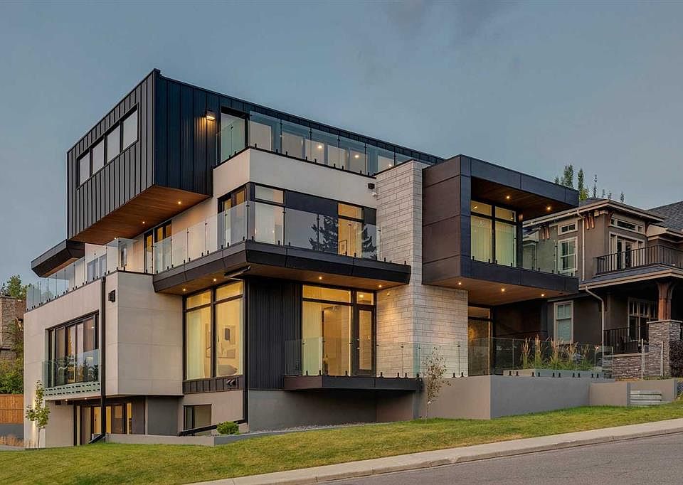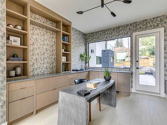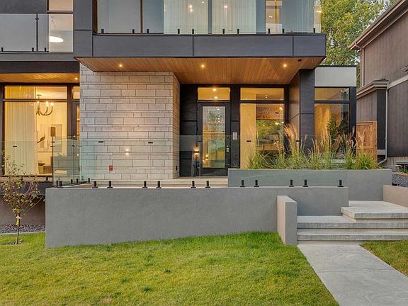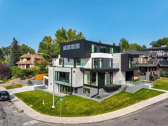 Envelop yourself in modern luxury and BREATHTAKING CITY AND RIVER VALLEY VIEWS. Designed by award-winning Midnight Design Studio and Stephanie Martin Interiors, this one-of-a-kind Briar Hill residence offers 4+1 bedrooms, over 7,400 sq ft of developed living space, and a seamless blend of sophistication, innovation, and comfort. The main level is airy and light-filled, with wide-plank hardwood floors, designer lighting, and expansive windows that frame every view. A welcoming sitting area transitions effortlessly into the living and dining spaces, anchored by a dramatic 60” linear fireplace, custom brass shelving, and statement Kuzco lighting. Multiple balconies and rooftop patios invite indoor-outdoor living at its finest. The chef’s kitchen is a showpiece, appointed with rift-cut white oak cabinetry, a striking stone island, stone countertops, and a full Miele appliance package. Entertaining is elevated by the adjoining butler’s pantry, complete with Cosentino countertops, custom tilework, built-in coffee station, under-counter fridge, and dishwasher. A private main-floor office with built-ins and patio access provides a quiet retreat, while a stylish 2-piece powder room completes the level. A monorail maple staircase or GLASS-WALLED ELEVATOR leads to the second level, where all four bedrooms open to private balconies. The primary suite is an indulgent sanctuary with a spectacular chandelier, wraparound balcony, custom walk-in closet, and spa-inspired ensuite featuring marble mosaic tile with in-floor heating, dual sinks, a 66” tub with freestanding faucet, oversized glass shower, ceiling speakers, and balcony access. Bedrooms 2 and 3 share a Jack & Jill bath, while bedroom 4 enjoys its own private ensuite. A well-appointed laundry room with sink and storage completes the floor. The third-level loft is designed for entertaining, offering a 25’ wet bar with sink and dishwasher, ceiling speakers, projector connections, and direct access to a spectacular rooftop patio with panoramic skyline and valley views. A convenient 3-piece bath ensures the loft functions as the ultimate entertainment hub. On the walkout lower level, find a spacious recreation/media room with wet bar, a professional-grade golf simulator, fitness studio, and guest bedroom with a 3-piece bath (including a steam shower). Additional highlights include a GLASS WALLED ELEVATOR to all 4 levels, Control4 home automation system, Sonos sound system, central air conditioning, custom drapery, Italian ceramic tile & designer wallcoverings. A 4-car tandem garage with hydronic heating, epoxy floors & EV charger provides effortless parking for multiple vehicles. This dazzling contemporary home combines unmatched style with a prime central location near U of C, Foothills & Children’s Hospitals, SAIT, shopping, schools, public transit, and just minutes to downtown.