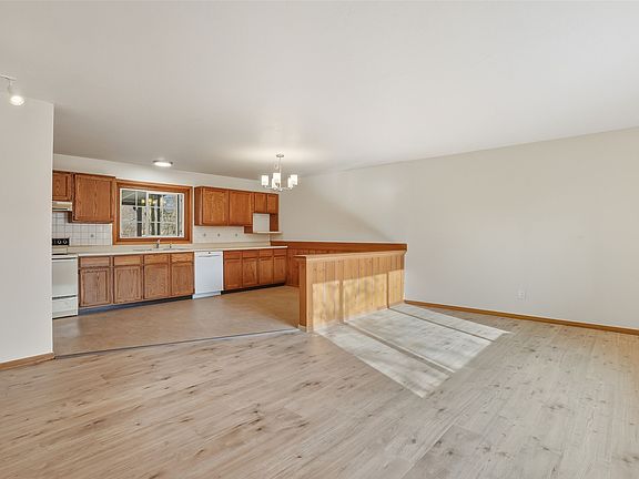 A large picture window in the Living Room imbues this spacious region with an abundance of natural light, while a distinctive half-wall adorned with attractive tongue-and-groove pine accents at its base demarcates the Dining Area and the Kitchen quite nicely, giving a sense of place for each use, without boxing in the footprint.