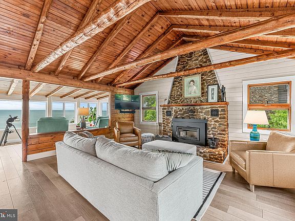 Welcome to your dream waterfront log cabin home in Scientists Cliffs! This beautiful property offers stunning views of the Chesapeake Bay and features an open floor plan with exposed beams and a cozy stone fireplace in the living room. The kitchen has been updated with modern soft close shaker cabinets, quartz countertops, and uniquely colored appliances by Big Chill. This charming cabin boasts 3 bedrooms, and 3 full baths. A newly renovated basement featuring a full bathroom with a traditional hot stone sauna. Coming home after a long day and relax and unwind in your very own sauna - a luxurious addition that will surely elevate your lifestyle. This stunning property has undergone significant upgrades in recent years, making it a truly modern and comfortable home. The HVAC system, windows, water heater, and flooring have all been replaced within the last 3 years, ensuring that the house is energy-efficient and well-maintained. The new patio provides a perfect outdoor entertaining space, while the addition of a new fireplace with a steel chimney liner adds both charm and functionality to the home. The repointed stone work adds character and durability to the exterior, ensuring that the house will stand the test of time. Enjoy the community amenities such as walking trails, private beach access with multiple access points (one just a short walk from the house,) pool, tennis courts, boat ramp, basketball court, playground, and more. Located just minutes from Prince Frederick and Solomons Island. This property offers easy access to PAX NAS, Andrews, DC, and Annapolis. With the added bonus of being a short walk to American Chestnut Land Trust's hiking trails. For cultural experience there is Annamarie Sculpture Gardens & Arts Center, (close to Solomon Island) with multiple community events and exhibits within a short drive where you can enjoy outdoor art installations from the National Gallery of Art and Hirschhorn museum. There are multiple wineries within a short drive as well. This log cabin home in Scientists Cliffs is the perfect blend of nature and modern comfort. Don't miss out on this incredible opportunity to own a piece of paradise!